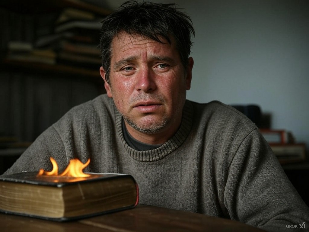 Der gelernte Industriemechaniker, der des Lebens überdrüssig ist, verbrennt seit mehreren Jahren einmal im Monat eine Bibel und hofft von einem fanatischen Christen dafür getötet zu werden. Er erklärt seine Gedanken wie folgt:
